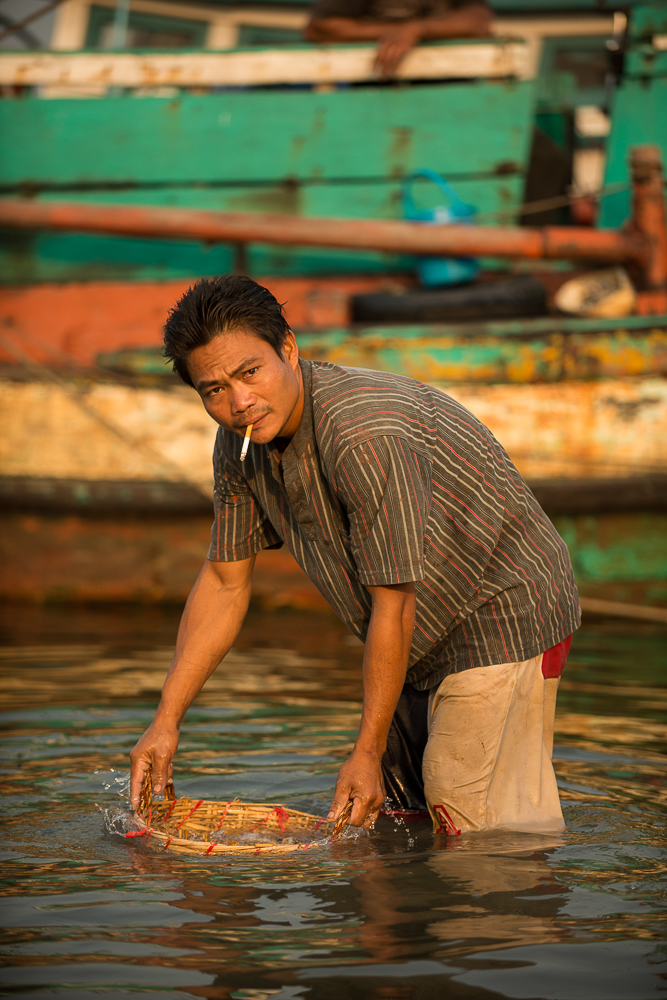 I rode my moped out to Kampot to photograph the nights catch being brought in as the sun rose.The fishermen’s families were waiting on the shore for them, whilst the women began trading the fish the men sat alone or with their children to relax on the prow of their boats. I began from a distance with the long lens (Nikon 70-200mm F/2.8) and as I became comfortable got closer in amongst the action, as the baskets of fish and crab were passed down from the boats to the shore.