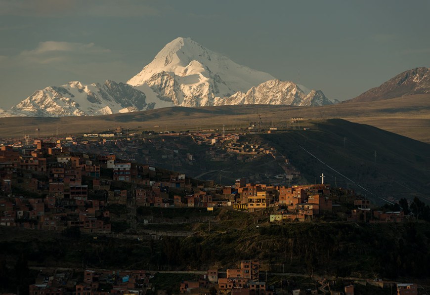 From Sorata it was a painfully uncomfortable minibus ride into the de facto capital of Bolivia – La Paz, which is the highest (de facto) capital in the world at 3650 metres. (Sucre is officially the capital of Bolivia but La Paz is the seat of government and everything runs from here.) From the city centre I caught a taxi up to El Alto (The Heights in Spanish), which is now recognised as a separate city, overlooking La Paz at an altitude of 4150 metres up. From a viewpoint next to the main road I spent both evenings photographing the late light catching La Paz below.