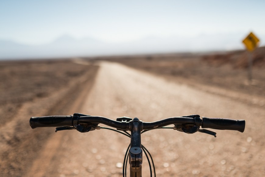 Bicycle on road to El Valle de la Luna (Valley of the Moon), Atacama Desert, El Norte Grande, Chile