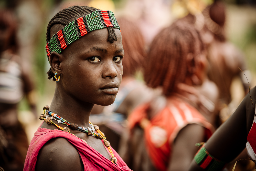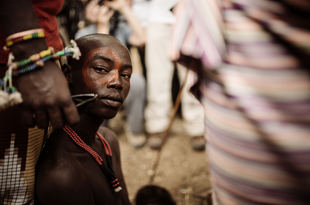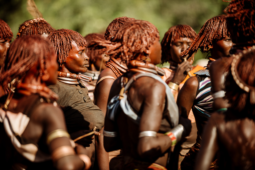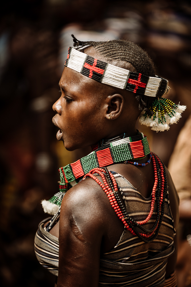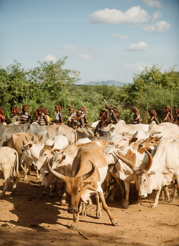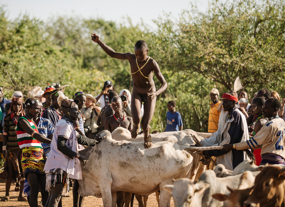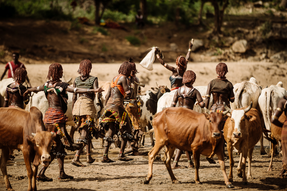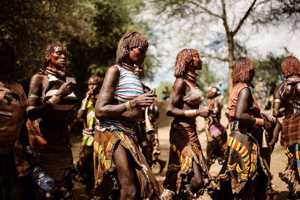 When a boy from the Hamar tribes is ready to ‘come of age’ he must complete the ‘Ukele Bulla’ (Cattle jumping) ceremony. This event usually happens after the harvest, and upon completion allows the man to marry, own cattle and have children. Prior to the jumping the female relatives of the man gather and demand to be whipped, the ‘Maza’ (a man who has already jumped the cattle within 3 months) uses a long fin stick to strike the women and girls on their exposed back. It is a consensual act, with the females begging the Maza for more. The more scarring on the womens back, the more devotion it shows to their families.