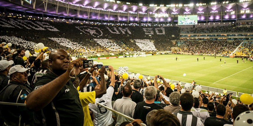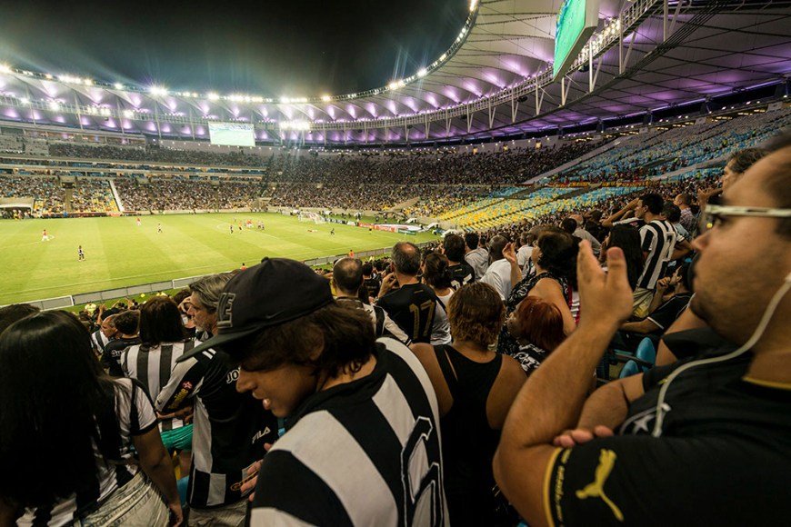 Fans enjoying game between Botafogo (of Rio) and Unión Española (of Santiago, Chile), Maracanã Stadium, Rio de Janeiro, Brazil